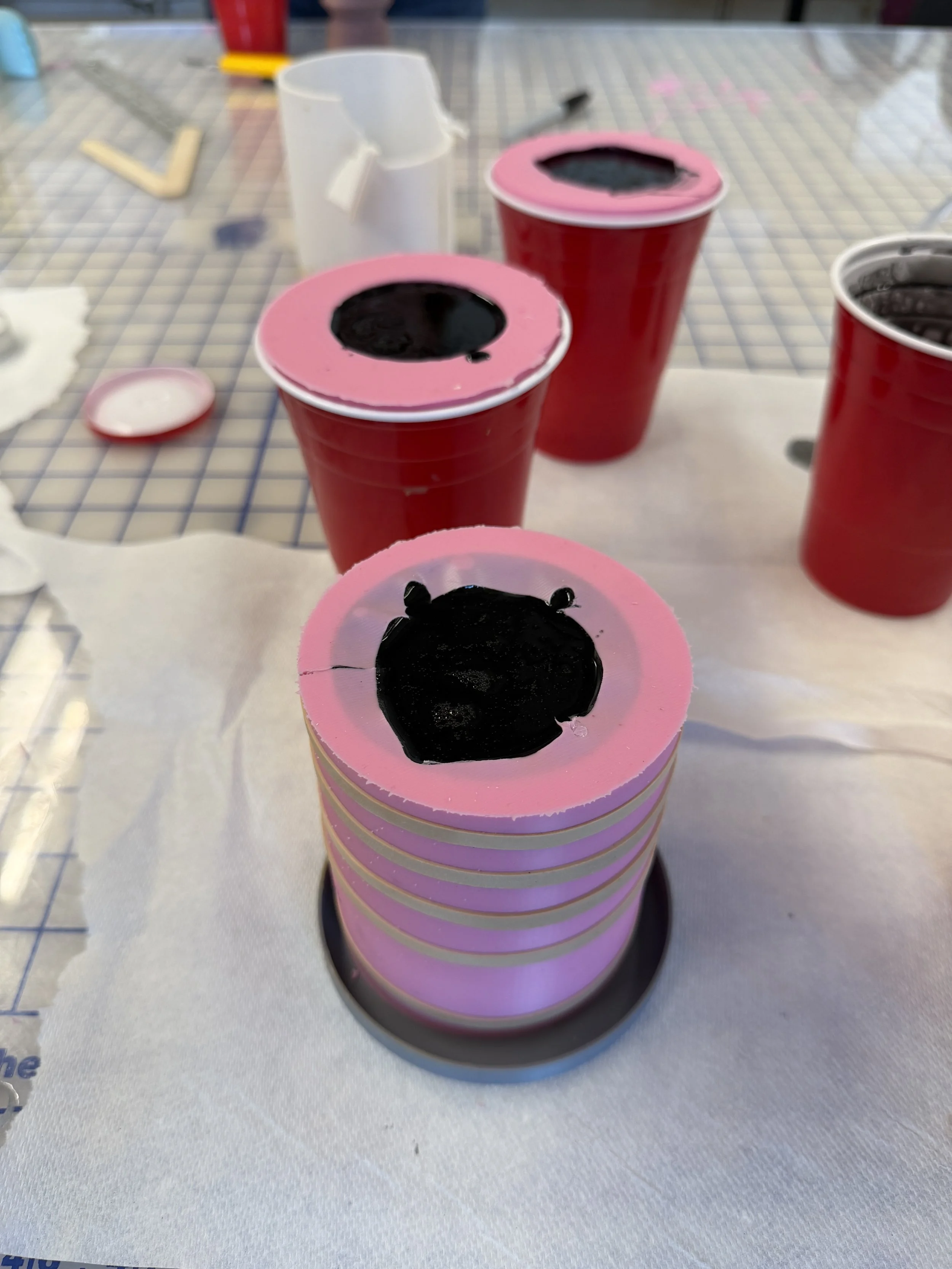 After creating the positive form, I began exploring different casting methods. I produced three variations of the egg cup using onyx resin, white resin, and concrete. This stage required a high level of attention to detail, as even small mistakes could impact the final result. Because my original form exceeded the size of a standard Solo cup, I also had to create a custom mold to accommodate the dimensions.